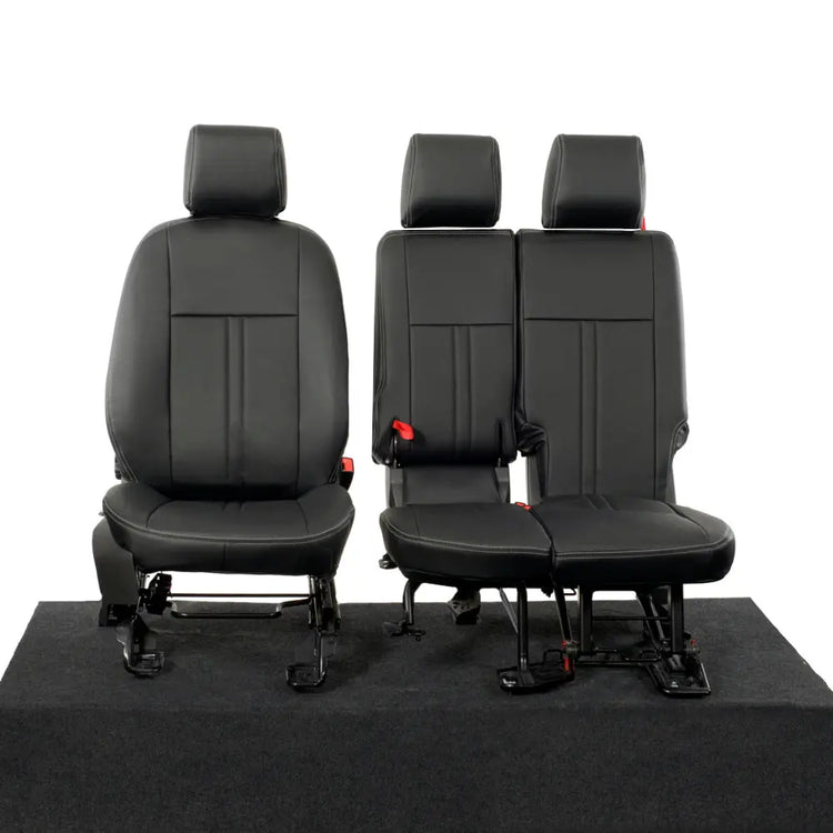 These tailored seat covers feature a 5mm foam backing with tricolette fabric on the outer sections, while the centre sections offer a thicker 10mm foam backing, providing enhanced comfort and protection. The high-grade leatherette material is engineered to resist water and wear, helping to preserve your Transit Connect's interior from daily use and spills.